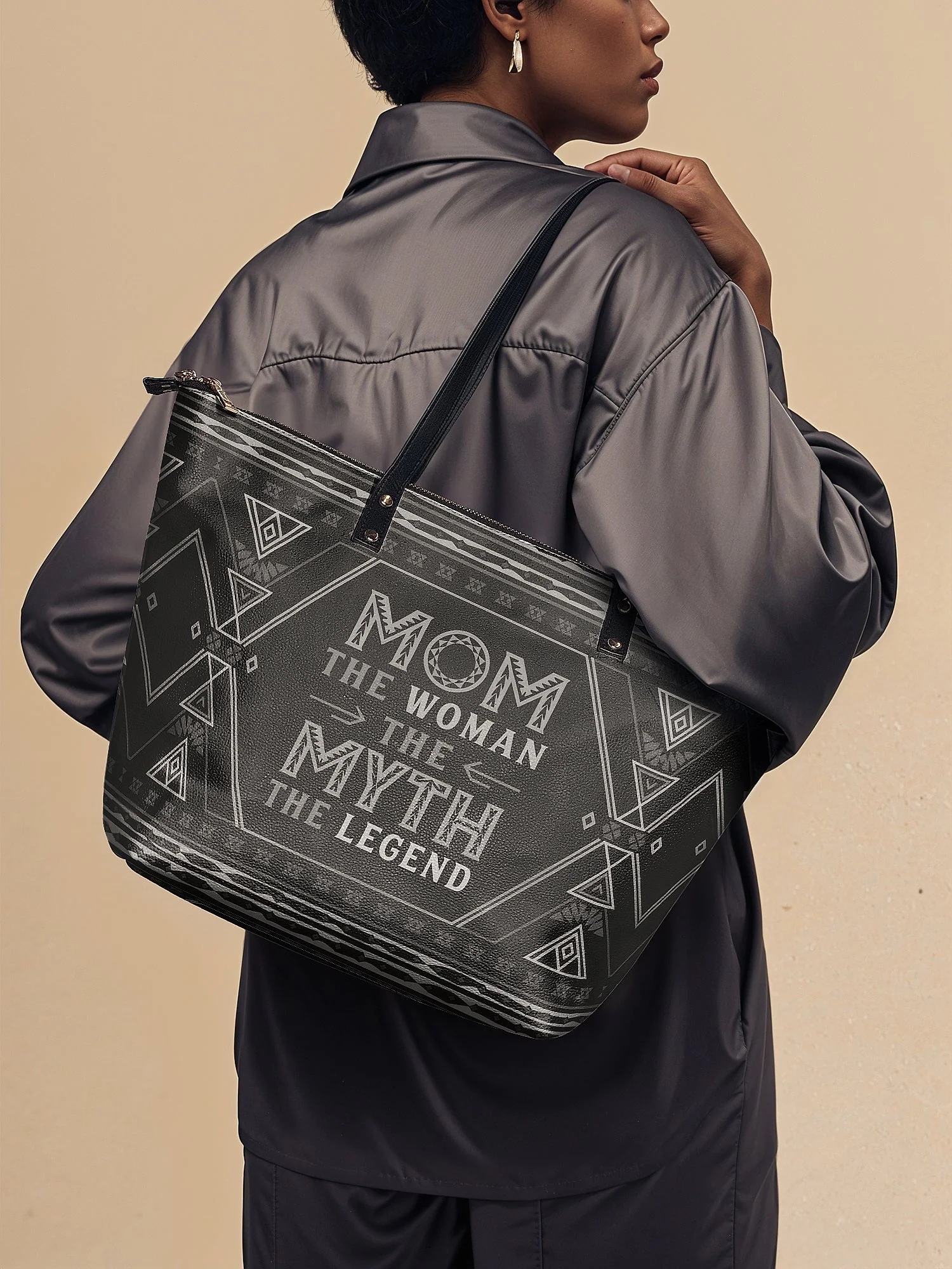 Featuring the bold quote "Mom – The Woman, The Myth, The Legend!", this tote is a powerful reminder of a mother's influence, resilience, and enduring greatness. Designed with Afrocentric patterns in a sleek black finish, it embodies both cultural pride and timeless elegance—a perfect statement piece for moms who lead, nurture, and inspire.