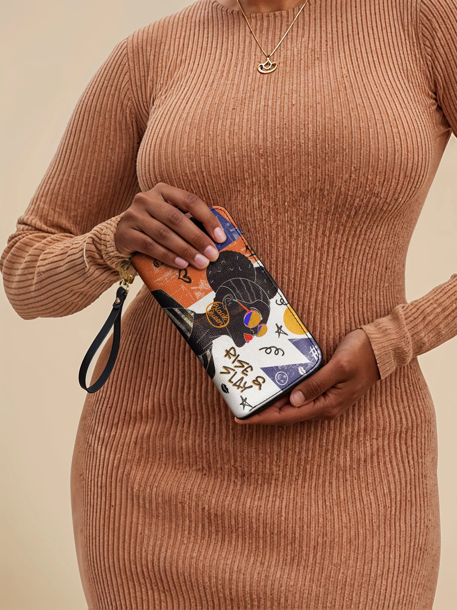 The Sanaa Wallet, named after the Swahili word for "art" and "work of beauty," is a stylish symbol of confidence and power. Part of the Rise & Slay Collection, it features bold Afrocentric artwork and the empowering phrase "Rise & Slay," reminding you to embrace your strength every day.
