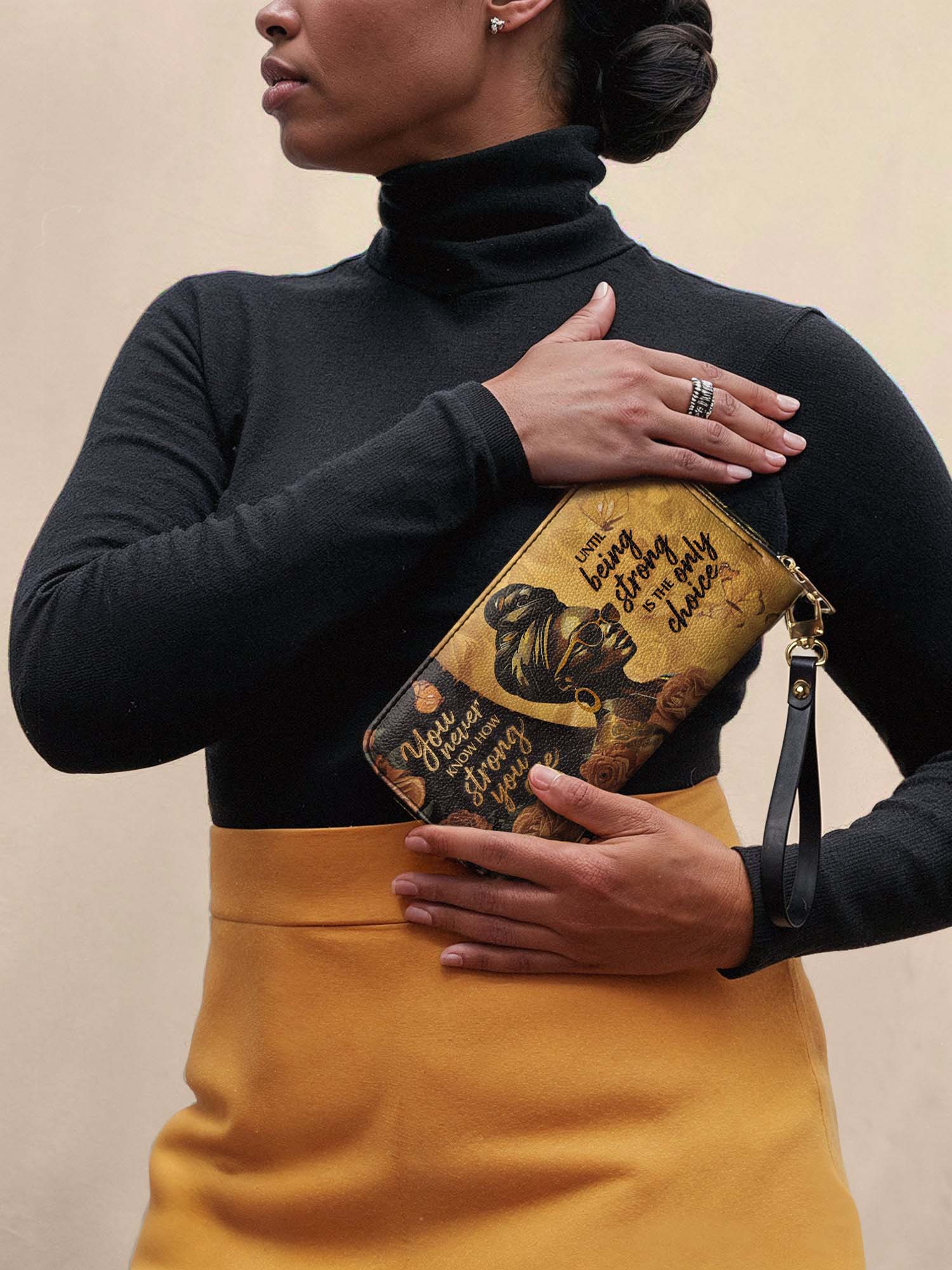 The "Siyanda" Strong Wallet is a tribute to the resilience and courage of Black women. Featuring the empowering quote "You never know how strong you are until being strong is the only choice," this wallet is a daily reminder of your inner power. With elegant golden tones, beautiful rose details, and a bold design, it blends strength and sophistication. Keep your essentials secure while carrying a message of empowerment everywhere you go.