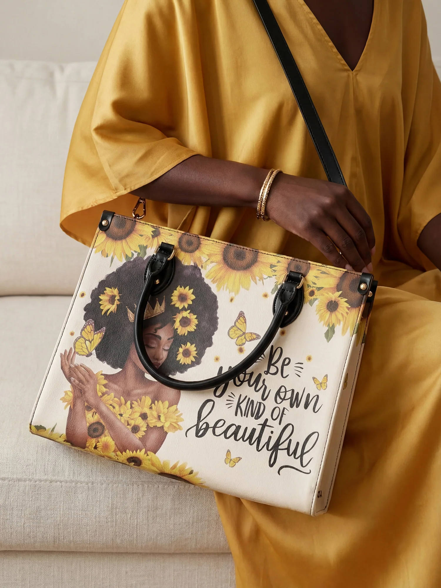 The Zuriya Handbag, inspired by the Swahili name Zuri, meaning "beautiful", is a celebration of Black women’s unique beauty and self-love. Featuring the empowering quote "Be your own kind of beautiful," this bag reminds you to embrace your radiance with confidence. Decorated with sunflowers, butterflies, and a regal queen, Zuriya is more than a handbag—it’s a statement of self-worth, pride, and the beauty of being unapologetically you. Carry it and shine!